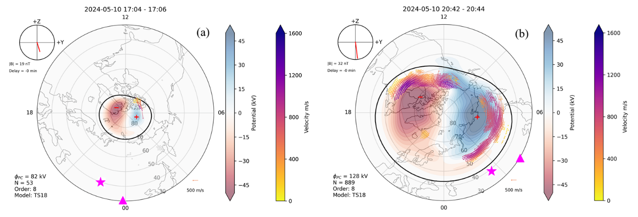 图 3. 包含六台子午工程 CN-DARN 雷达的所有北半球 SuperDARN 雷达数据计算电离层极区对流在平静期(a)和强磁暴期间(b)分布。洋红色的五角星和三角代表子午工程在中国北部HEJI台站和YUZH台站的光学干涉仪位置。黑色实线标出了极区对流的边界。