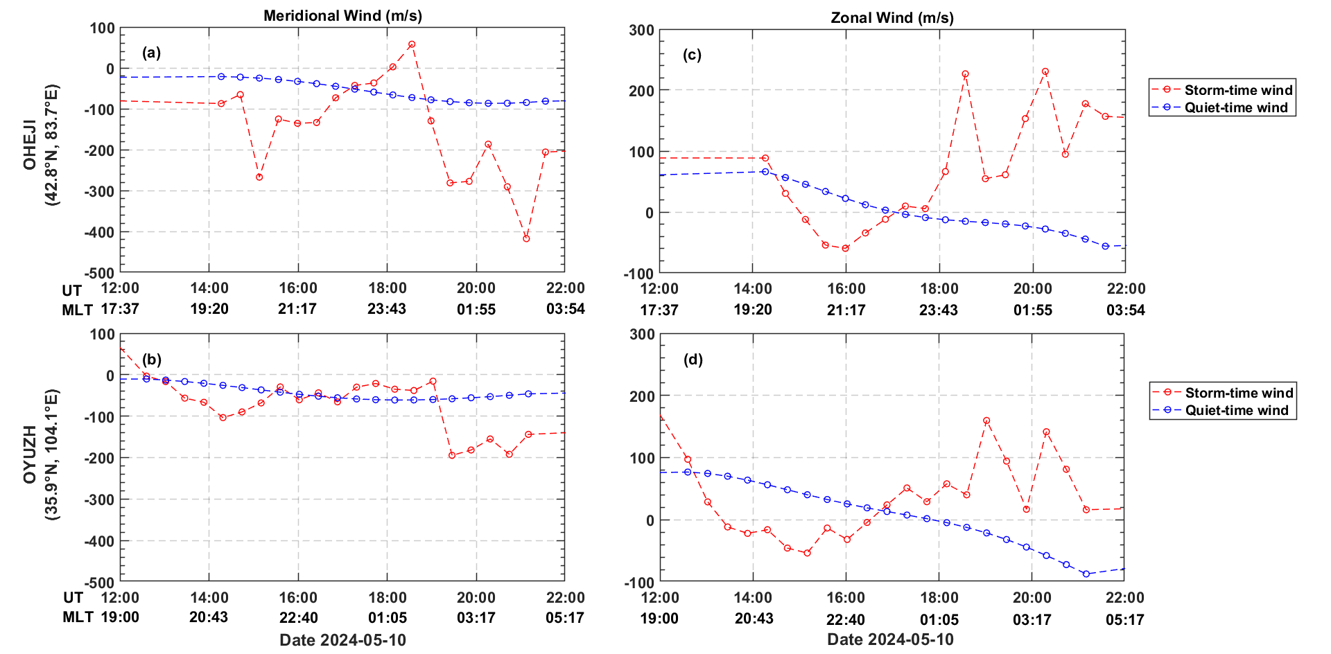 图 2. 2024 年5月10日 子午工程光学干涉仪DCOI在HEJI台站(地理位置:42.8°N, 83.7°E)和 YUZH台站(地理位置:35.9°N,104.1°E)站观测到的 250 km的中性风变化。红色圆圈表示经向中性风(a-b)和纬向中性风(c-d),蓝色圆圈表示相对应的平静期的风场。